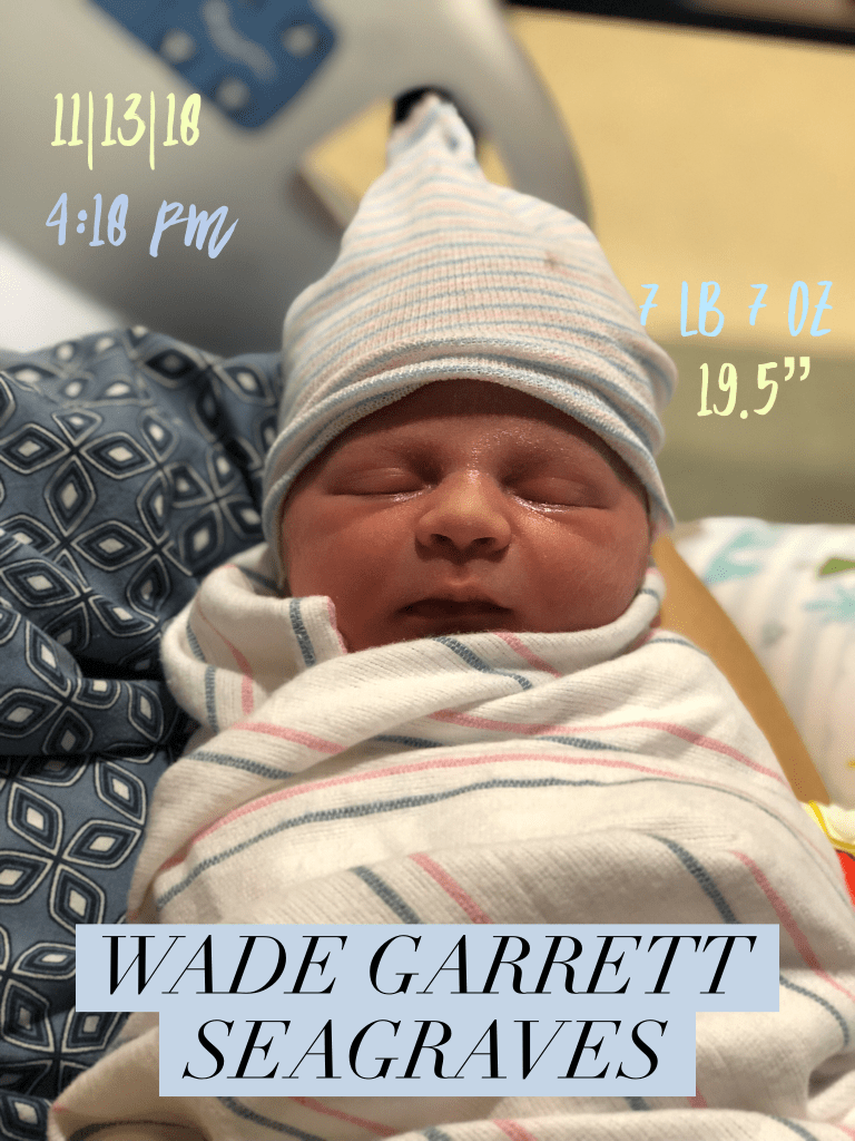 At 4pm they came in and got everything ready for me to start pushing. A few minutes later, we began. This is the part of my pregnancy I actually feel like went smooth and easy for me! I pushed for a grand total of ten minutes before Wade made his grand debut! My midwife, nurses, Garrett, and mom were all so amazing! My midwife took things really slow with me, she used a lot of oil to stretch me as we went, because I was terrified of tearing or an episiotomy! My mom, sister-in-law (who photographed the birth), and Garrett all had instructions to watch for scissors and take them away if they saw them! Lol. My last few pushes Wade was stuck. And I could feel the ring of fire they talk about. After a couple more contractions, he was here! He was perfect and beautiful. He was crying and immediately got to lay on my chest. It was the absolute best moment of my life. Garrett and I were on cloud nine! Coming in at 19.5″ long, 7 lbs 7 oz on Tuesday, November 13, 2018 at 4:18pm, our baby boy was here. Our lives were changed forever in the best way possible! And I didn’t tear at all! Hallelujah! Sorry for the TMI, but it’s a birth story, so what’d you expect?