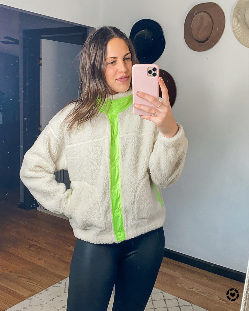 I ran into Old Navy the other day because they were having a killer online sale… but I know better to go in because the sales are NEVER as good in store as they are online! But, I did find two great things and this was one of them! This sherpa jacket is actually fully stocked and super cute! It’s not cropped but it is shorter like waist level, so if that’s not your jam, keep that in mind! I found it on the clearance rack for $10 which is a total steal… but it does go on sale often so if you’re wanting it, keep an eye on my Insta page and I’ll share when it’s on sale again! I love the neon detail, it’s the perfect light jacket to run errands in! I wouldn’t recommend it if you’re looking for something to keep you warm, but if you like to look cute while being cold, you should get it! I’ll link it here if you want to get it!